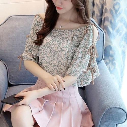 [엄지척]여성 여름 러플 소매 플라워 오프 숄더 요정 블라우스_19642482_667501