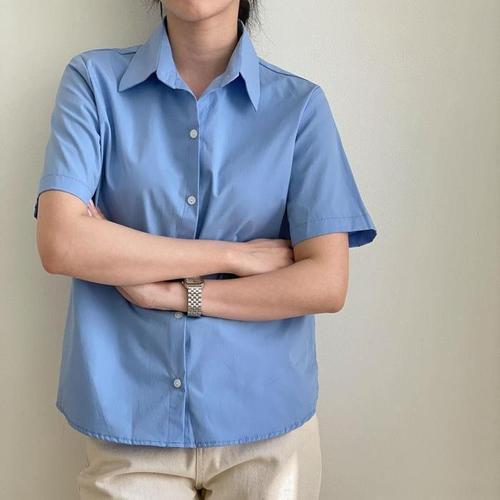 [옷자락]여자 솔리드 옐로우 블루 반팔면남방 워싱 기본 셔츠