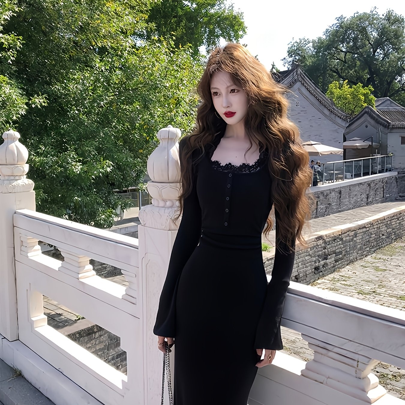TEMU 젠틀 퍼우드 앤 섹시 티 스타일 소셜라이트 스타일 여성 여름 속옷 U넥 긴팔 강조 데보르 벨벳 드레스