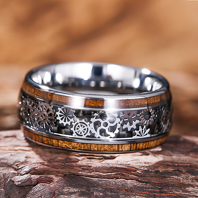 TEMU 316L 스테인리스 스틸으로 제작된 스타일리시한 기어 링 (남녀 공용). 코아 나무 배합 밴드가 특징이며, 광택 돔 디자인으로 약혼 및 결혼식에 적합합니다. 힙합 펑크 록 자전거 테마와도 잘 어울립니다.