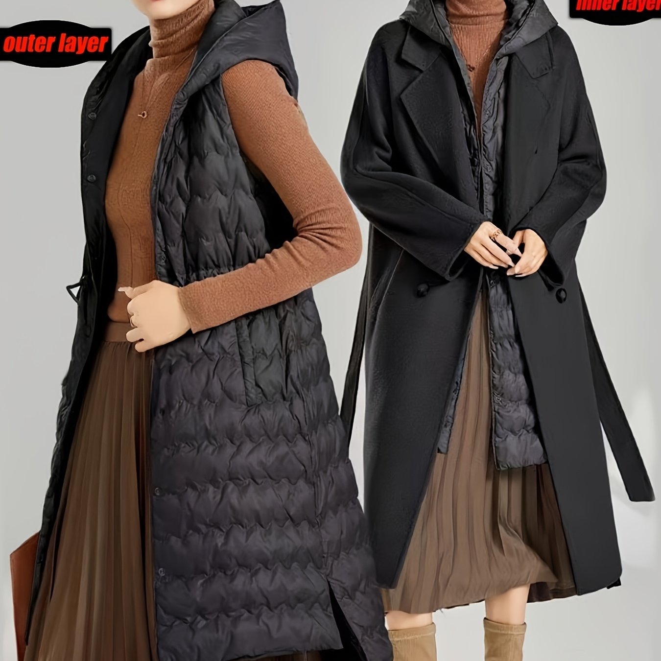 TEMU 여성 우아한 후드 V넥 조끼 - 가벼운 따뜻한 플리스 안감 중간 길이 아우터웨어 조절 가능한 드로스트링 허리, 단색 다용도 레이어링 피스 봄/가을, 캐주얼에서 공식적인 의상, 캐주얼 웨어 조끼 | 우아한 V넥 조끼 | 플리스 안감 내부