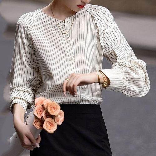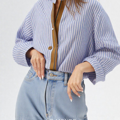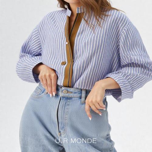 [유아몽드]루즈핏 유니크 스트라이프 블라우스 배색라인 버튼 디