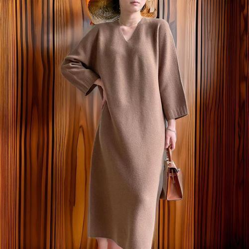 [신상오픈런]여성용 브이넥 울 니트 롱원피스 뒷오프닝 봄 모임룩 (32328894)
