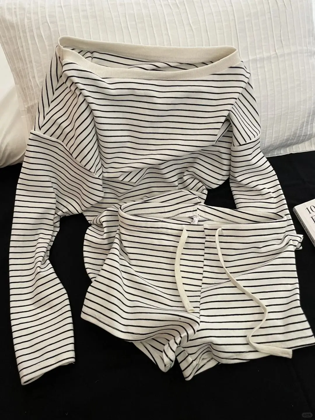 2025년 신상 여성용 블랙&화이트 스트라이프 오프숄더 반바지 긴팔 파자마 홈웨어 세트