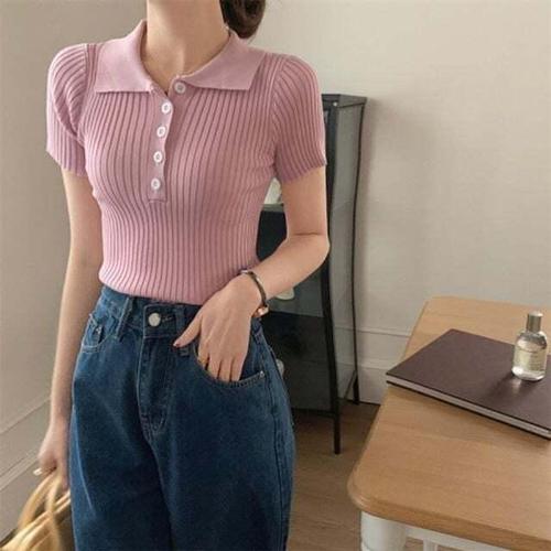 [셀럽하우스]이쁜라인 LOWI3003 소장용 5버튼 골지 카라 반팔 니트 7컬러