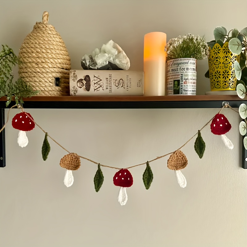 TEMU 수제 크로셰 버섯 가랜드 - 빨간색과 녹색 잎사귀, 전기 불필요, 자연스러운 감성의 벽 장식, 거실·침실·주방용 내구성 있는 패브릭 홈 액센트, 요정 스타일, 공예품