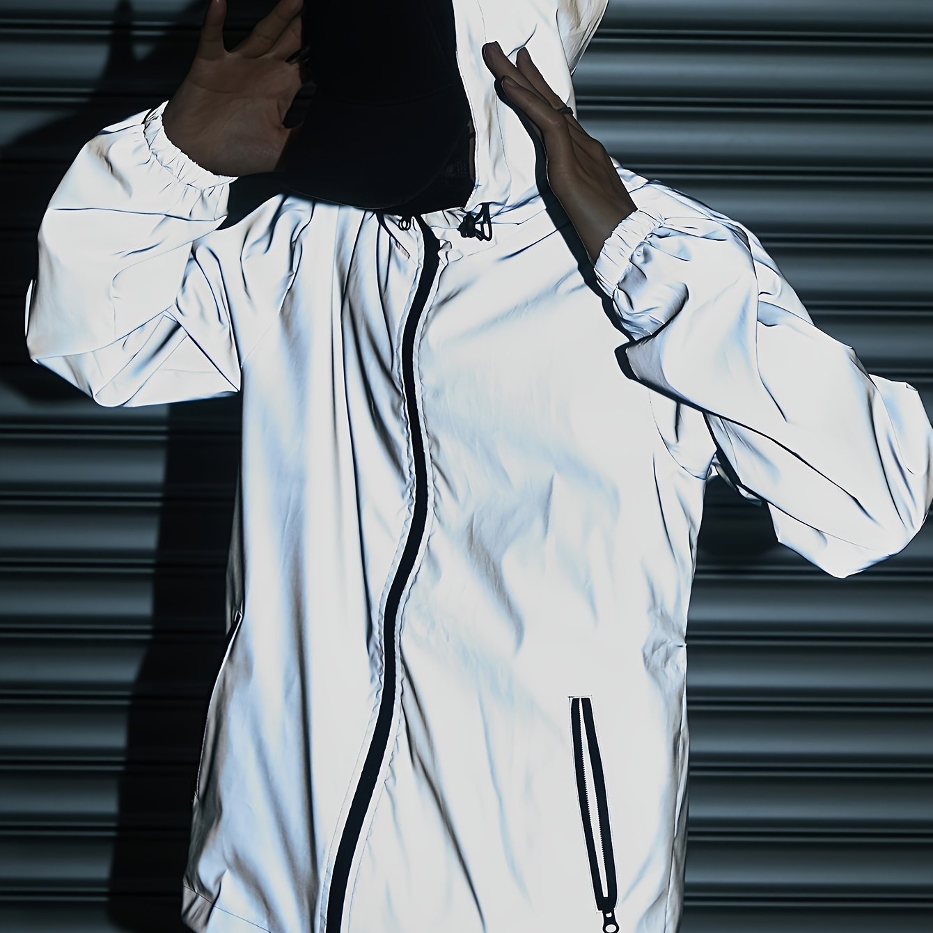 TEMU 남성용 방풍 풀 리플렉티브 자켓 - 후드 지퍼업 긴팔 아우터웨어, 야간 러닝 및 댄스, 도시 출퇴근용 올시즌 스트리트웨어 코트 - 손세탁 쉬운 , 내구성 있는 아웃도어 웨어, 힙합 패션, 고품질|댄스복