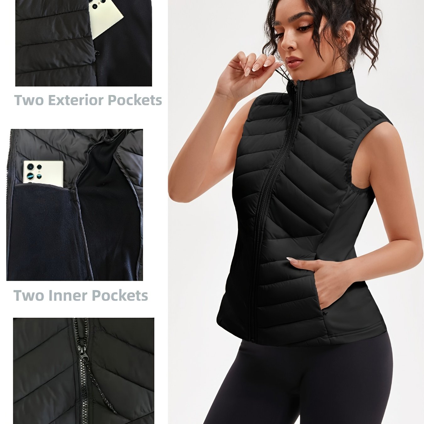 TEMU 여성용 경량 아웃도어 퍼퍼 조끼, 멀티포켓 디자인, 탄력 있는 허리 랩핑으로 따뜻함, 독특한 지퍼, 스탠드 칼라, 폴리에스터 충전재