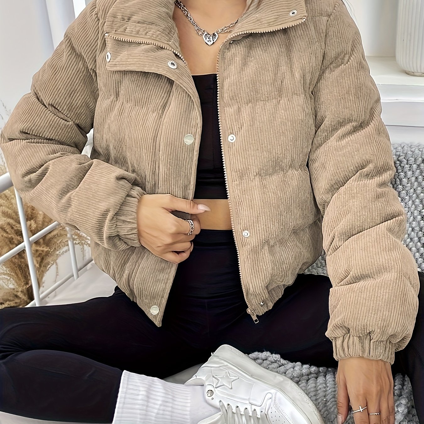 TEMU 여성용 스타일리시 퍼퍼 재킷, 골지 커프스 - 가을 & 겨울용 포근한 긴소매 지퍼업 코트, 캐주얼 단색 아우터, 겨울 재킷