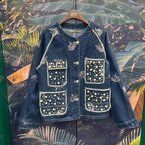 미즈큐즈 / 블랙 진주 별 레터링 자수 포켓 데님 청자켓