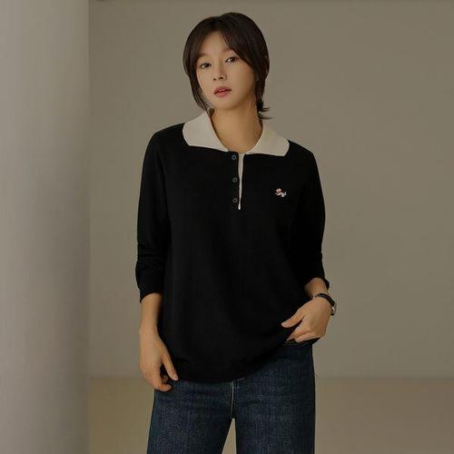 [엘리시아]러린 자수 버튼 배색 카라 티