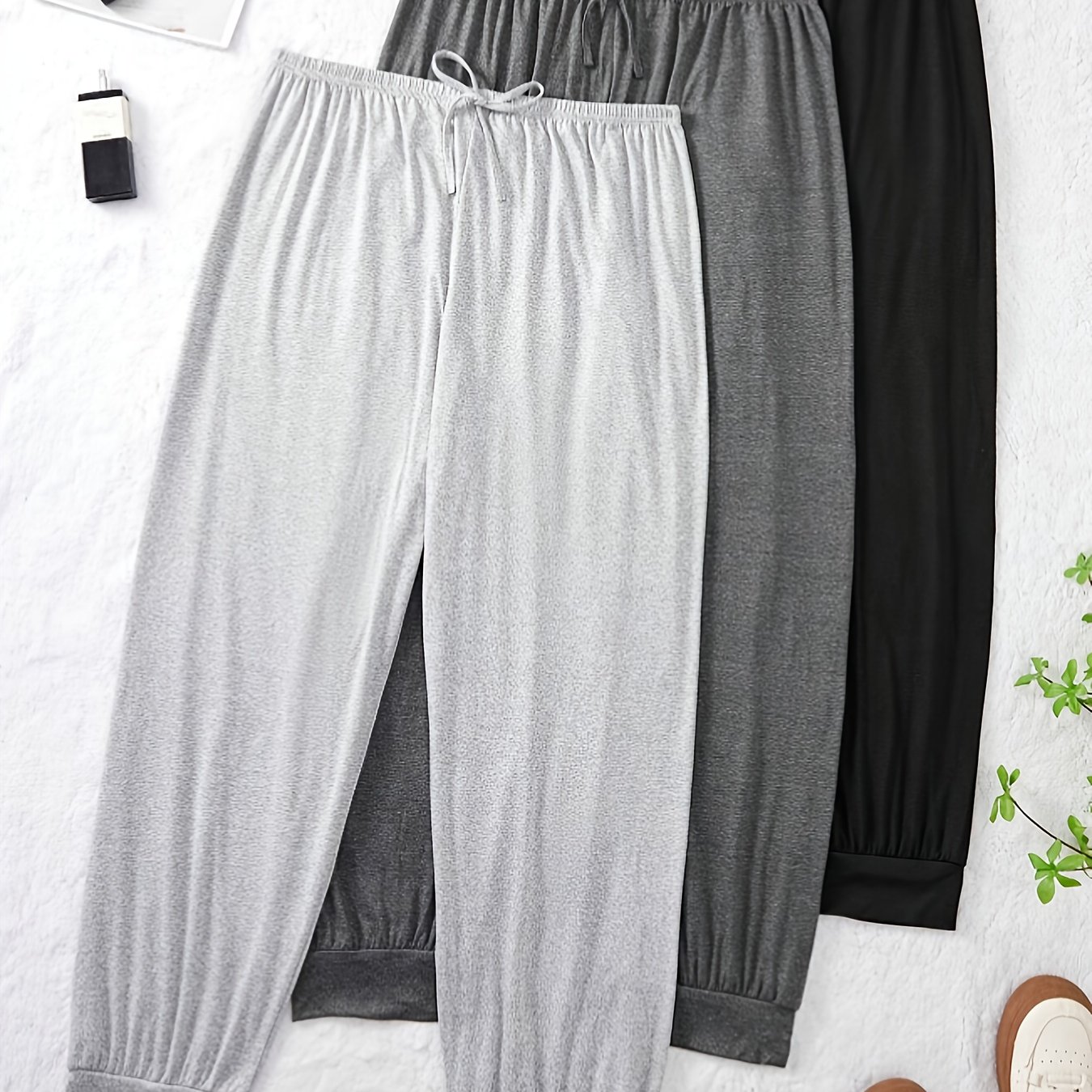 TEMU 여성용 단색 파자마 3종 세트 - 사계절 실내복, 라이트 그레이/다크 그레이/블랙, 신축성 있는 허리밴드, 부드러운 원단, 집, 외출, 여가를 위한 편안한 바지