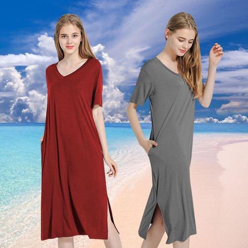 [오너클랜]인기상품 롱원피스 브이넥 면 홈웨어 잠옷 반팔 원피스 [WFLRZDD_260420]