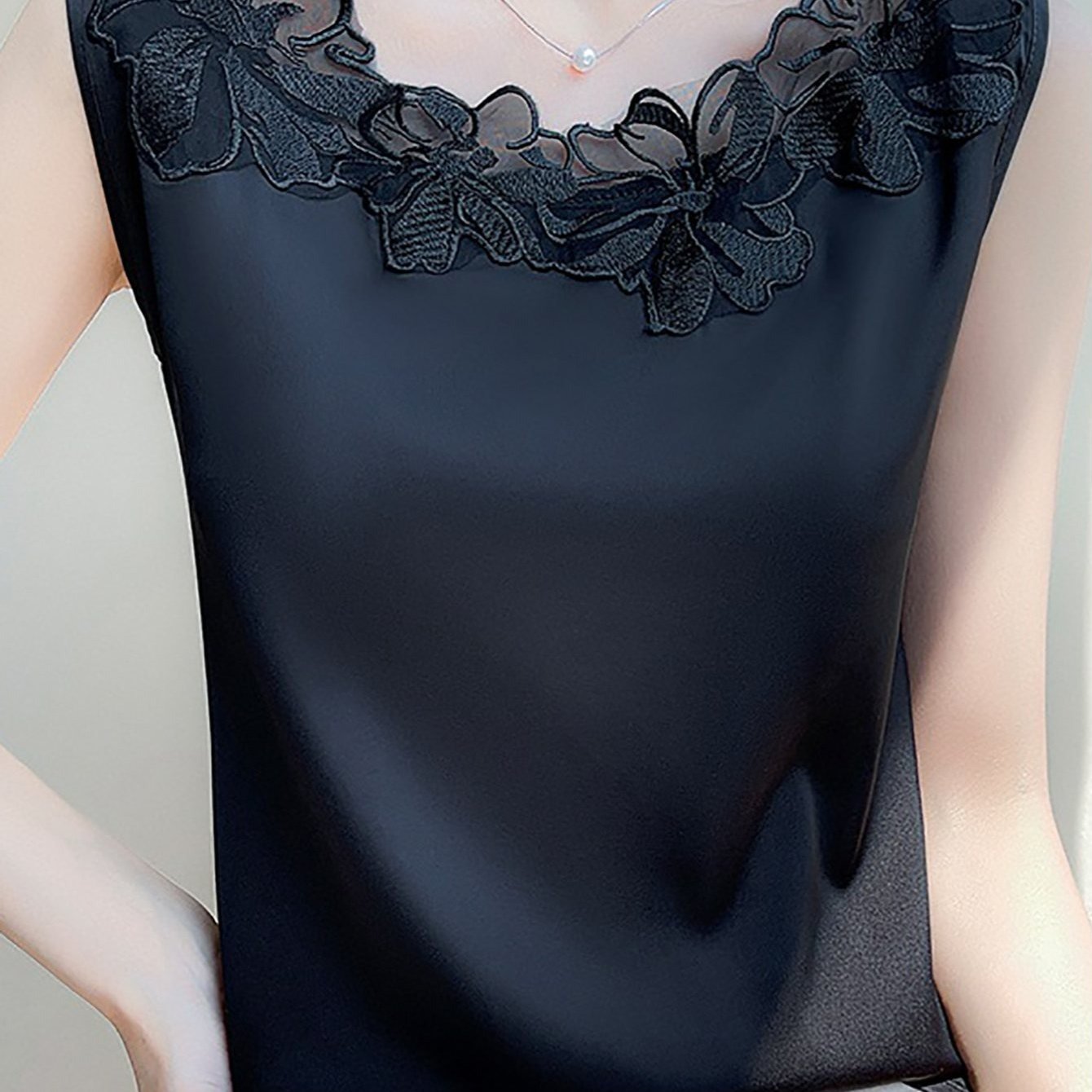 TEMU 여성용 세련된 레이스 플라워 라운드 나시 여름 빅사이즈 편한 실크 새틴 민소매티셔츠 정장 이너 나시티 상의