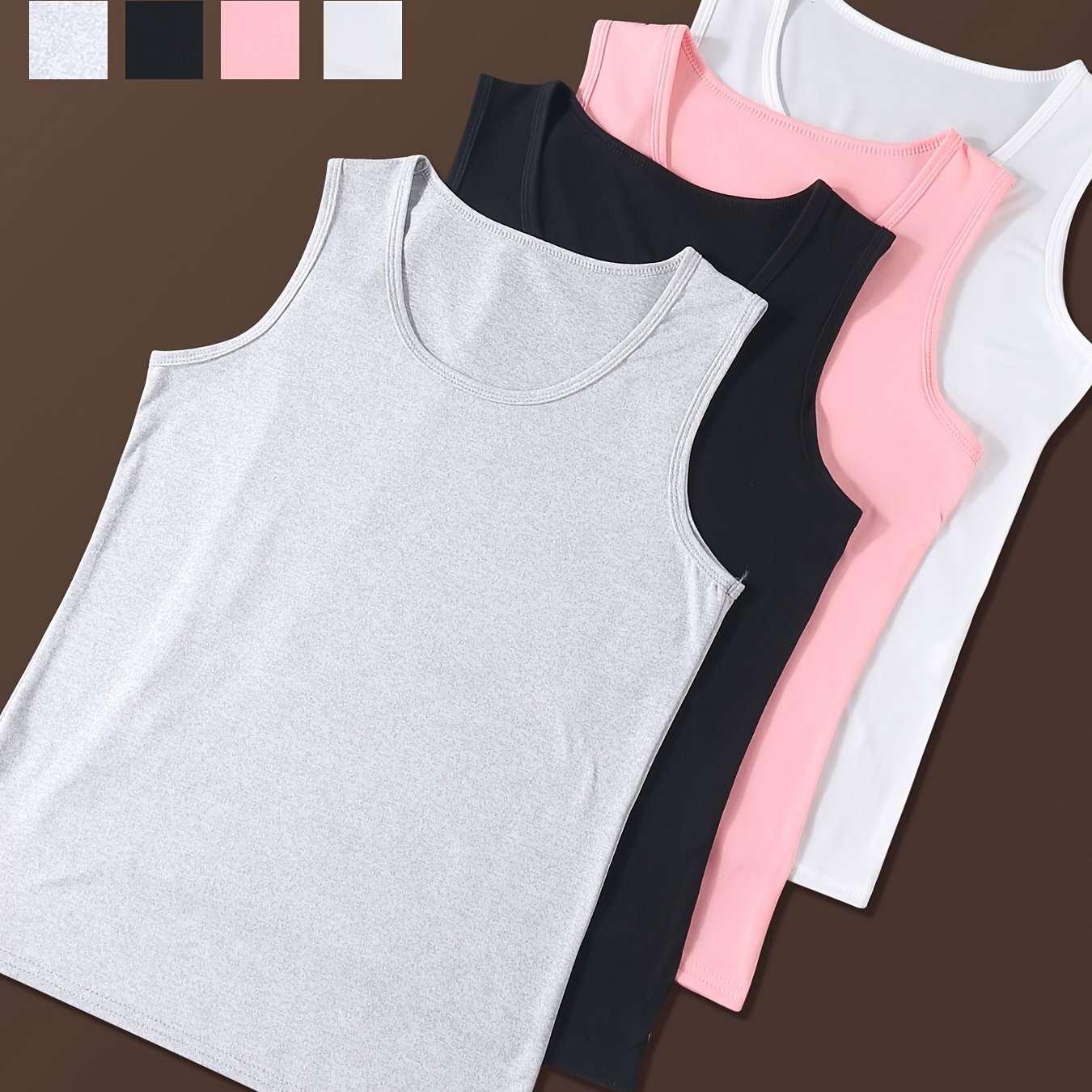 TEMU 부드럽고 신축성 있는 원단으로 제작된 여성용 민소매 탑 4종 세트. 루즈핏으로, 블랙, 화이트, 핑크, 그레이의 네 가지 단색으로 제공됩니다. 봄, 여름의 캐주얼 레이어링에 이상적이며, 패딩이 없는 부드러운 디자인을 특징으로 합니다. 미니 소매가 있는 기본적인 탱크 탑입니다.