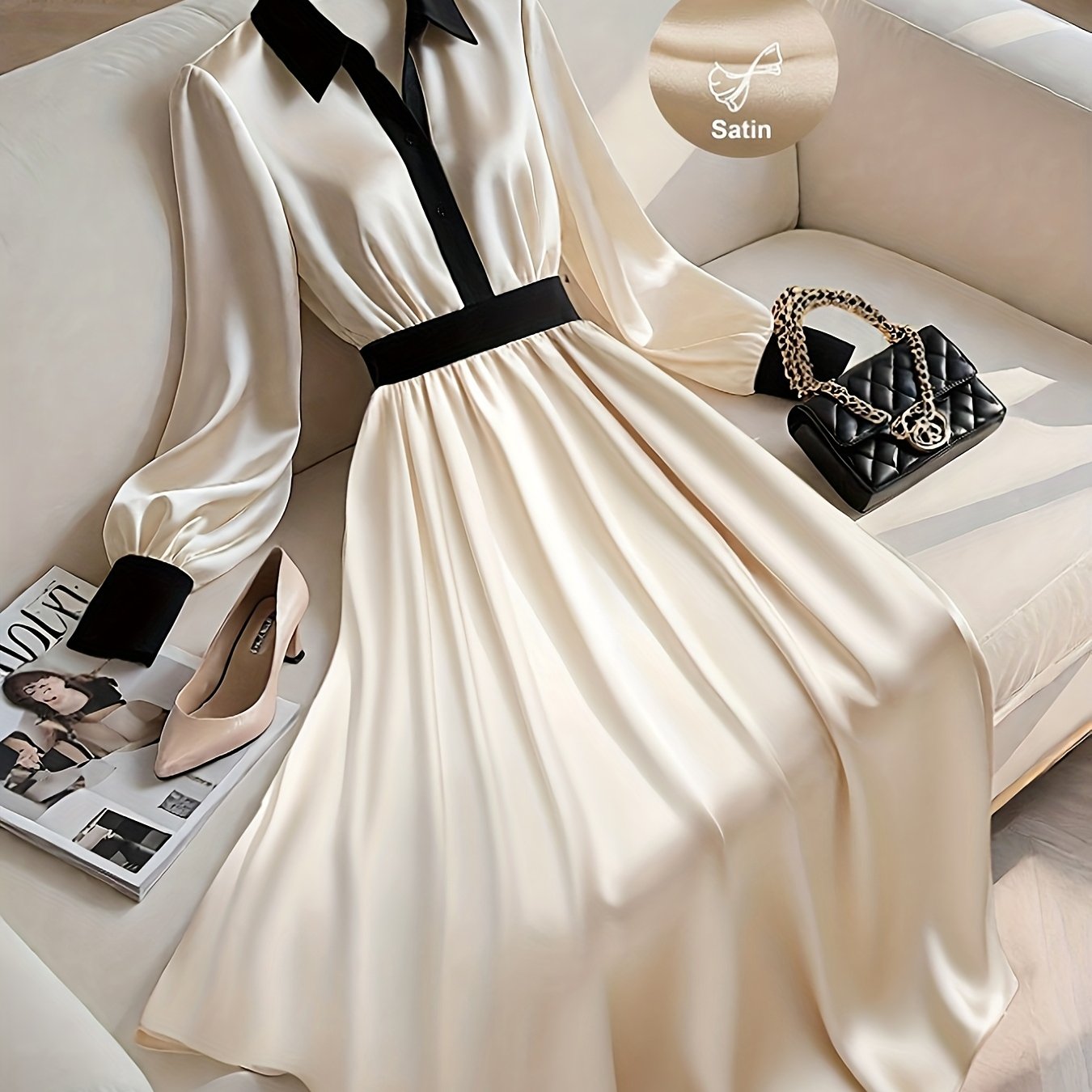 TEMU 여성용 우아하고 대비되는 드레스 - 긴소매 A라인 실루엣, 라펠 칼라, 오피스 및 파티용 구조적인 핏