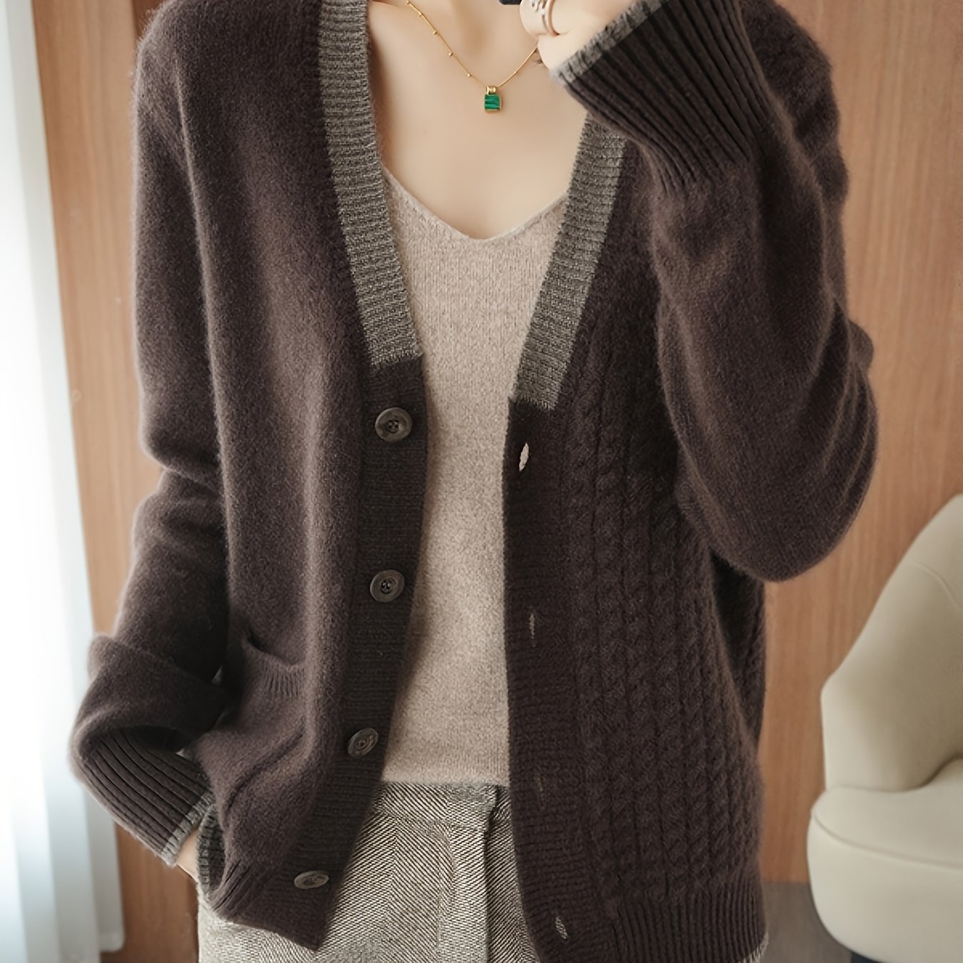 TEMU 여성용 우아한 프렌치 스타일 가디건 - 컬러 블록 디자인의 V넥 긴팔 버튼업 스웨터, 소프트 브라운 & 그레이, 가을/겨울 레이어링에 완벽, 다재다능한 아우터웨어 또는 인너 레이어링 피스, 여성용 스웨터 가디건, 고품질 여성용 가디건, 가을 옷