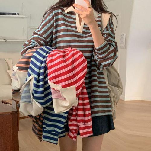 유니픽 여성 가을겨울 편안한 루즈핏 스트라이프 긴팔 맨투맨 세로넥wbr