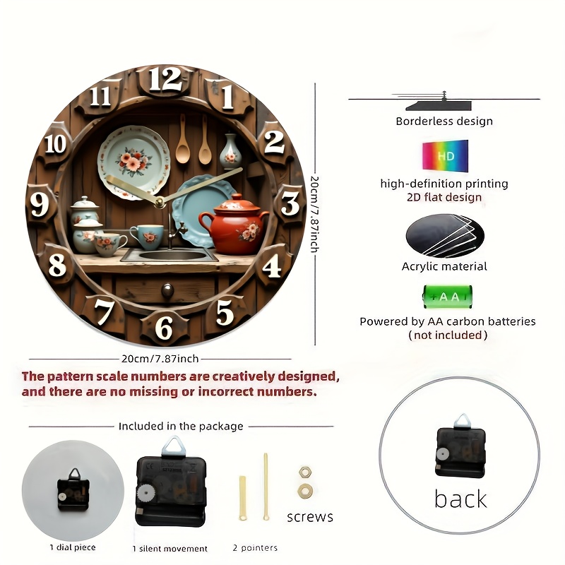 TEMU 8인치 빈티지 주방 벽시계, 찻주전자, 그릇 & 숟가락 디자인 - 조용한 쿼츠 운동, 비광택 아크릴 패널, 거실 또는 침실을 위한 러스틱 팜하우스 장식, 독특한 선물 아이디어 (배터리 미포함), 클래식 시계, 내구성 있는 구조, 홈 데코레이터, 레트로 미학, 고품질 공예, 홈 데코 애호가, 2D 플랫, 크리스마스에 가장 적합, 추수감사절에 완벽