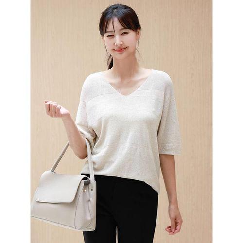 [드리다]여성 여름 홀가먼트 브이넥 빅사이즈 반팔 니트 티 40-50대 미시 중년여성 엄마옷 캐주얼 출근 ..