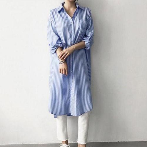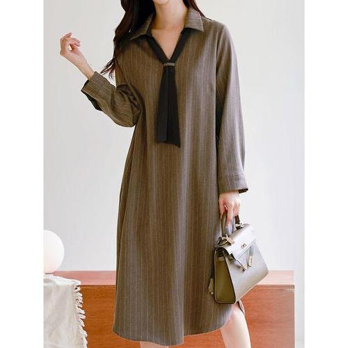 [에이치플러스몰]여성 중년 레이어드 셔츠 세로 줄무늬 패턴 롱 원피스