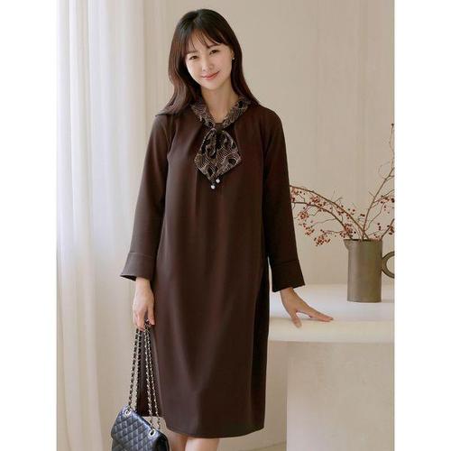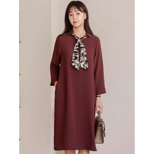 [드리다]여성 가을 카라 패턴 타이 스카프 빅사이즈 긴팔 원피스 40-50대 미시 중년여성 엄마옷 하객 모..