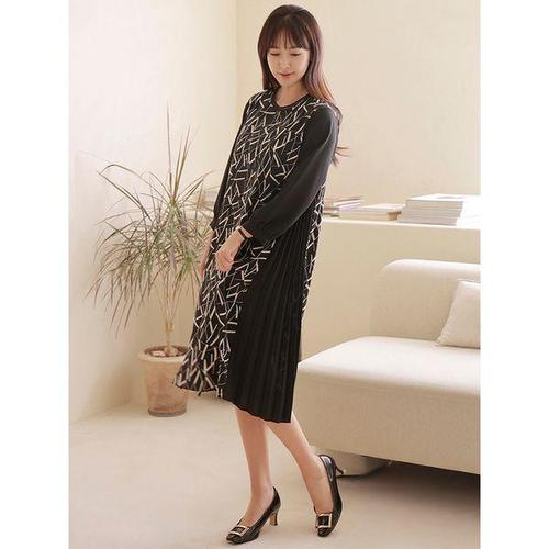[드리다]봄 가을 패턴 플리츠 배색 빅사이즈 쉬폰 긴팔 원피스 40-50대 미시 중년여성 엄마옷 하객 모임