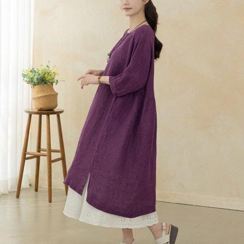 besteffie 린넨 원피스 중년여성 라운드넥 면마 린넨 A라인 롱 원피스 박스 원피스 E88