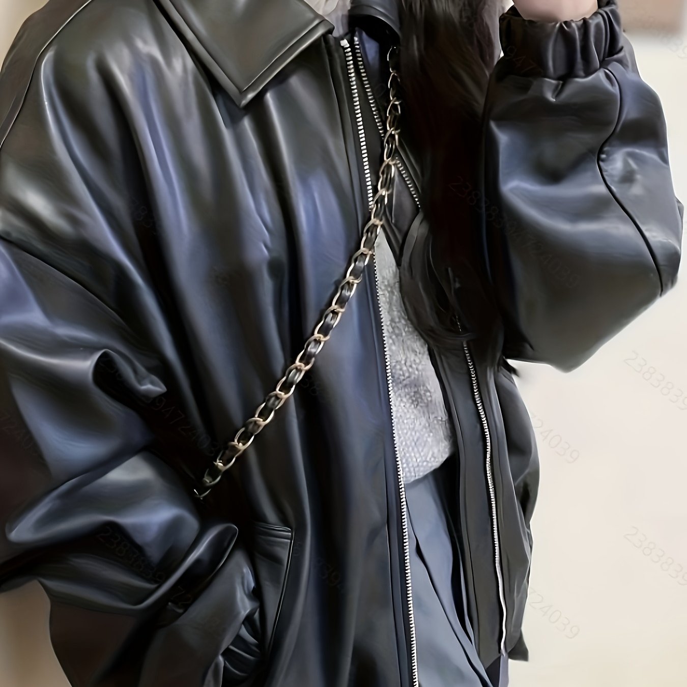 TEMU 여성용 빈티지 합성가죽 자켓 - H라인 겨울 코트, 전체 지퍼 프론트, 레트로 스타일 캐주얼 아우터웨어 (가을/겨울용 세탁기 세탁 가능 PU)