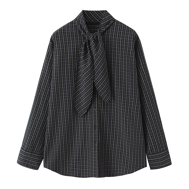 시크 패션 체크 셔츠 여성용 2025 신상 긴팔 스카프 칼라 여성 캐주얼 루즈 심플 스타일 셔츠 및 블라우스 탑