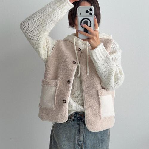 [옷자락]여자 뽀글이 배색 스웨이드포켓 단추 겨울 양털 조끼