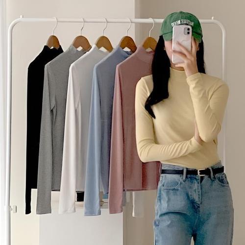 1+1 여자 목폴라티 캐주얼 가을 겨울 덕기모 반폴라 쫄티 슬림핏 심플 이너티 레깅스 상의 기질 여성 기모 긴팔 티셔츠 WXY