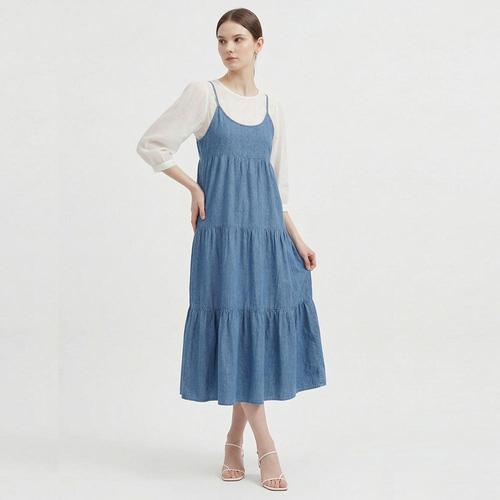 여성 끈나시 3단 캉캉 데님 청 롱원피스 MSE-WDR-21185-진청