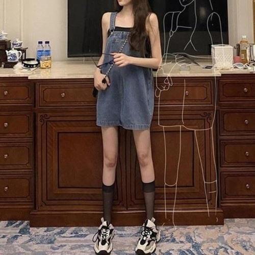 여성용 빅 사이즈 루즈핏 데님 멜빵 스커트 a라인 캐주얼 멜빵 스커트 뉴타임즈 F25402
