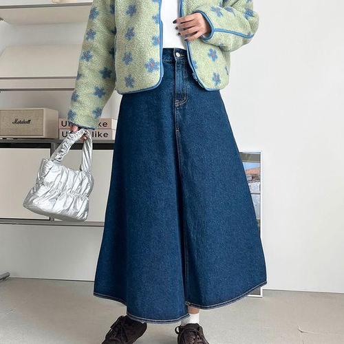 [에이치플러스몰]데님스커트 앞트임 플레어스커트 베이직 롱스커트
