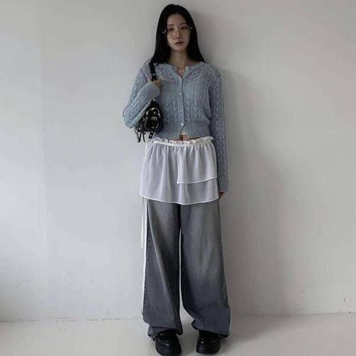 [에이치플러스몰]시스루 캉캉 셔링 롱스커트 니트스커트 청치마