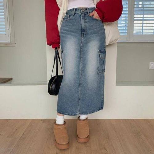 [신상오픈런]여자 언발 앞트임 A라인 포켓 청치마 뒷밴딩 롱스커트