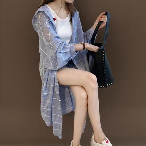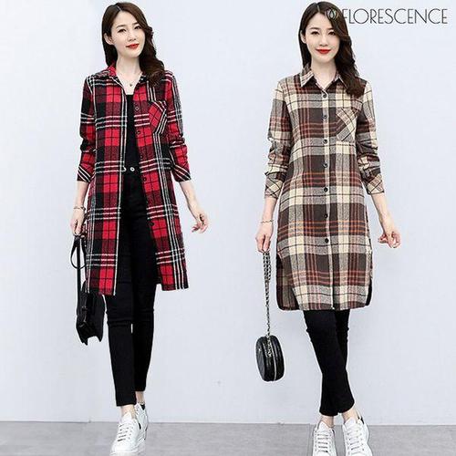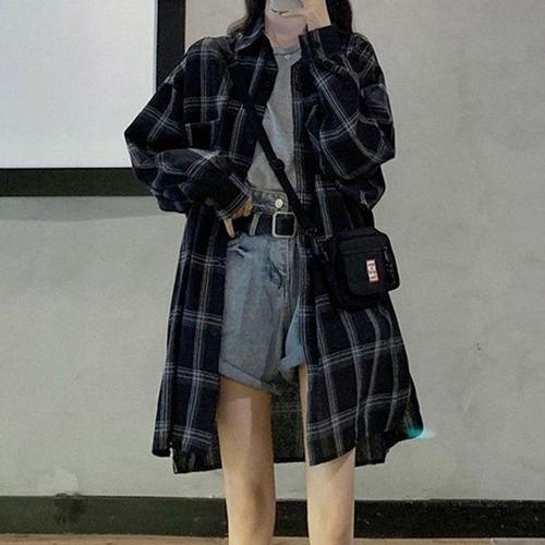 더시럽 여성용 루즈핏 미디엄 체크 롱 셔츠
