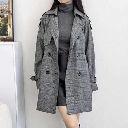 [옷자락]여성 체크 소매 안감 루즈핏 카라넥 트렌치코트 점퍼
