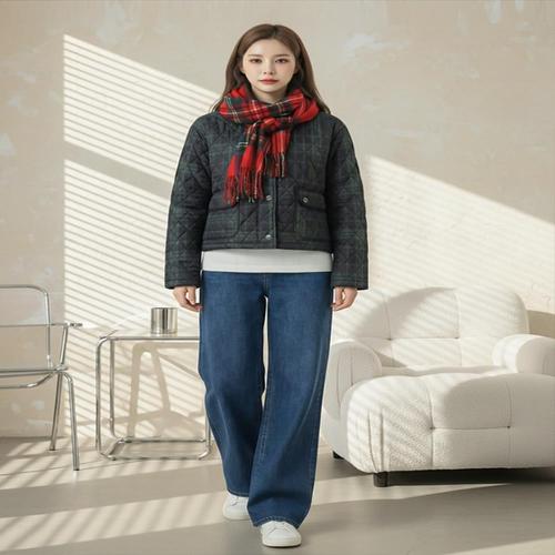 [옷자락] 여자 퀼팅 체크 숏패딩 투포켓 골덴카라 겨울 점퍼