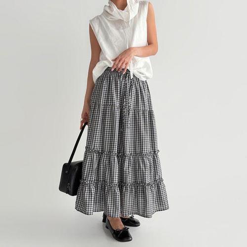 [옷자락]여자 여름 코튼 A라인 체크치마 캉캉 밴딩 롱스커트