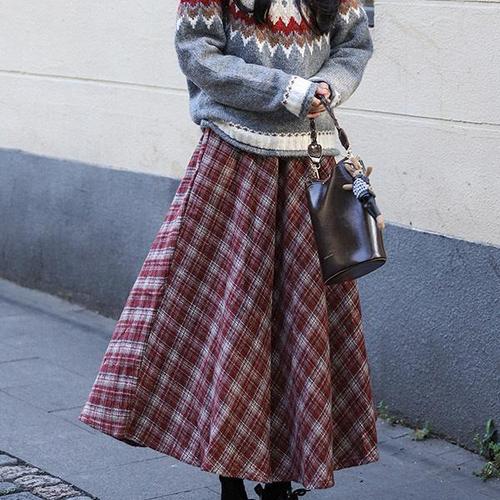 여성 체크 캉캉 러블리 가을 겨울 데일리룩 밴딩치마 모직 플레어 롱스커트 U389
