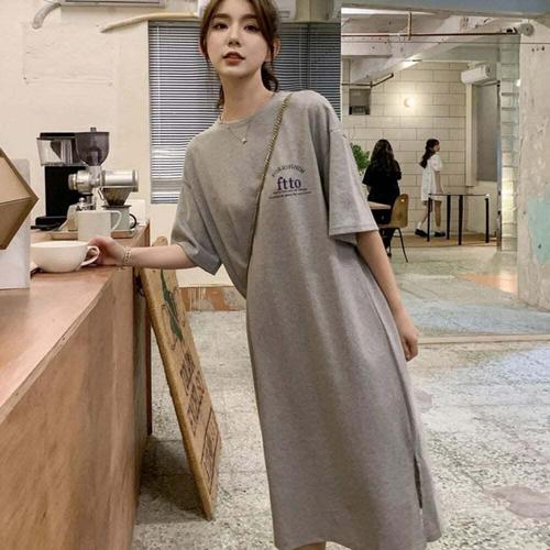 [모노무드]모노무드 체형 보정 여름 원피스 트임 디자인 캐주얼 반팔 홈웨어 레터링 드레스