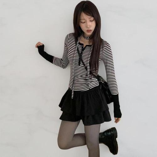 [옷자락]여성 간절기 초커 스트라이프 슬림핏 긴팔 티셔츠