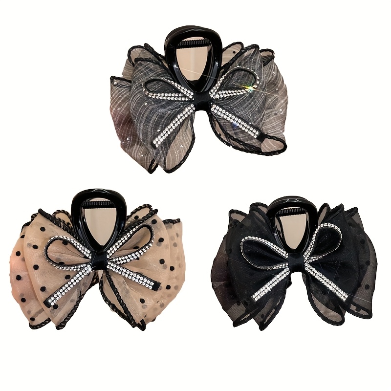 TEMU 3개 세트 우아하고 귀여운 메시 리본 헤어 클립 | 플라스틱 직사각형 상어 클립 세트, 컬러 매칭 리본 포함