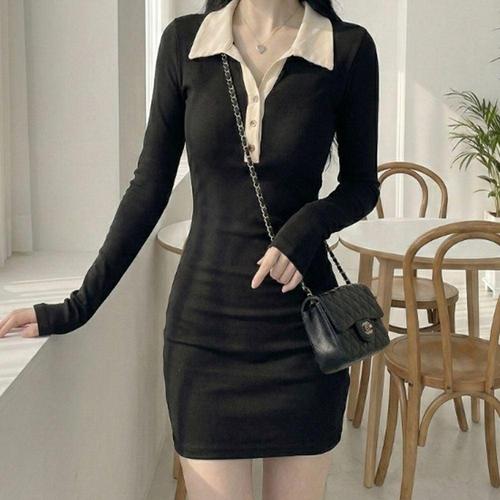 배색 카라 슬림핏 하객룩 긴팔 미니원피스 원피스 WFMU1TG
