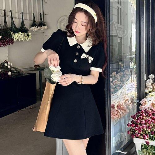 여성용 블랙 카라 미니 원피스 리본 장식 반팔 드레스 WFLIMYW