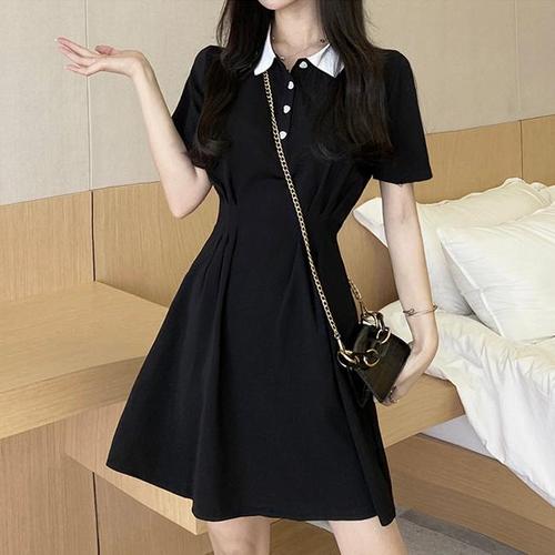 (스타일하우스) 원피스 OPS 리본브로치 카라 배색 반팔 블랙 플레어 미니원피스 AF-63