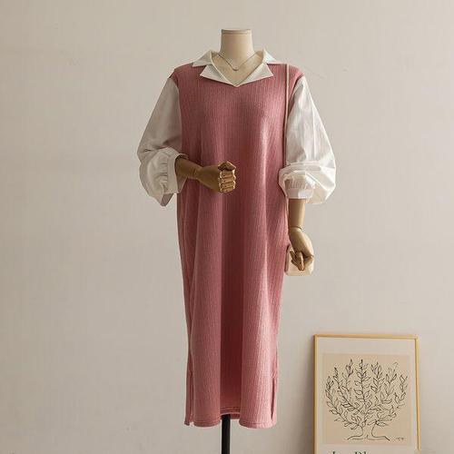 엘쏘 배색 니트 롱 긴팔 원피스