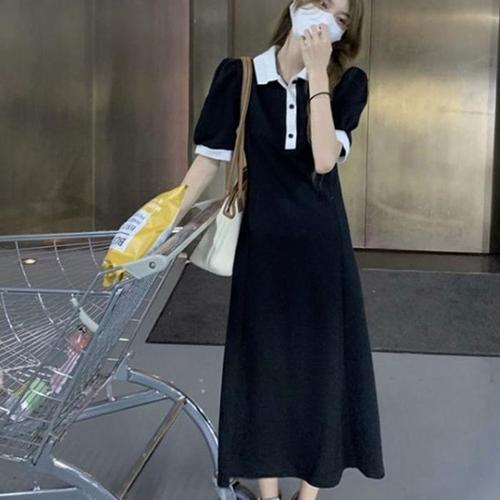 여성 청순 카라배색 반팔 롱 원피스 DHH-D83